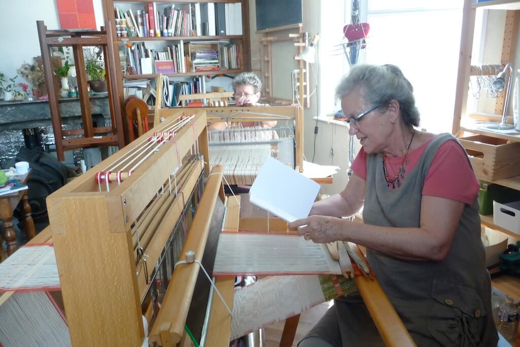 Joëlle et Lucie étaient des débutantes qui voulaient simplement découvrir le tissage. Les premiers jours, elles ont partagé leur temps entre l’étude de la théorie sur papier avec croquis, schémas, crayons de couleurs, gomme, et la pratique sur le métier à tisser. Ourdissage, enroulage d’une chaine en laine, puis montage suivi dans les lisses. Elles se sont ensuite essayées à la toile, au sergé, au natté… en jouant avec les matières, couleurs, grosseur…
