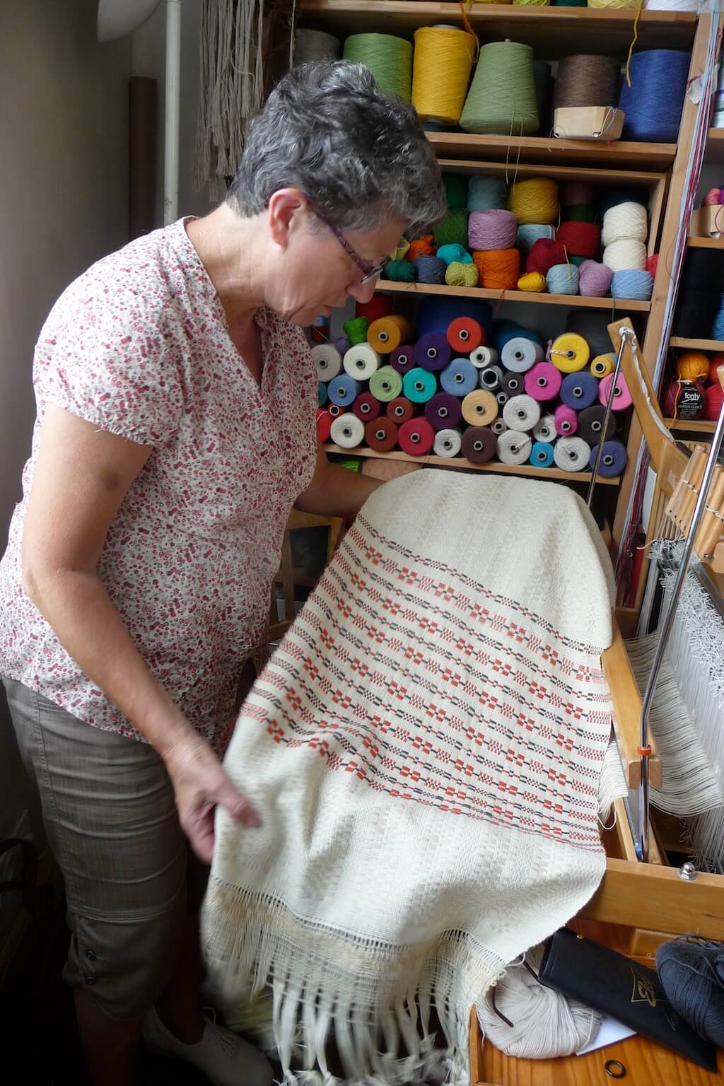 Claudine avait découvert le tissage lors d’un premier stage, et depuis elle revient chaque année pour réaliser un projet de son choix : après l’écharpe, les marque-pages pour ses cadeaux de Noël, ce fut cette année des coussins en laine, en armure « ceinture de moine » qu’elle découvrait. Il fallait voir son bonheur lorsqu’elle est repartie le dernier jour avec ses coussins prêts à être cousus…