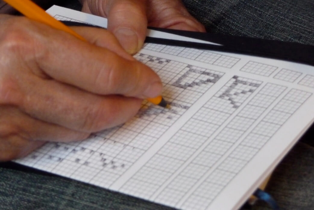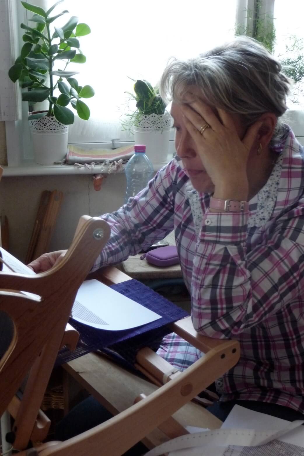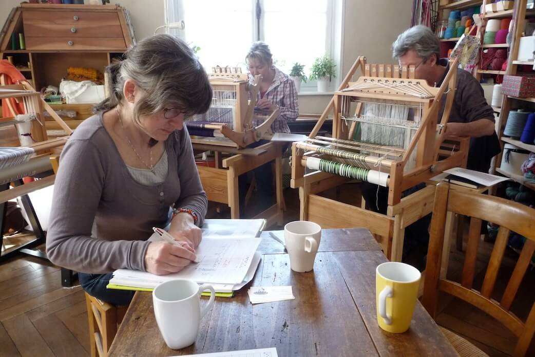 Les quatre stagiaires venus spécialement pour cette journée avaient ourdi leur chaîne, l’avaient enroulée sur le métier, enlissée selon les instructions transmises par mail à l’avance, et empeignée selon la densité requise en fonction du fil choisi. À partir de 10h du matin, nous avons commencé par dessiner sur le papier la manière dont les fils se levaient, s’abaissaient, étaient pris ou pas, et cela pour les quatre types d’enlissage différent proposés aux stagiaires. Ainsi, en préalable, nous avons anticipé ce qui allait se jouer sur le métier pour voir par avance les caractéristiques des quatre armures étudiés : Bronson, Swedich et huck, 4 et 8 cadres. Chaque stagiaire a pu ensuite aller sur son métier et vérifier que le résultat était conforme à ce qui avait été dessiné sur le papier.