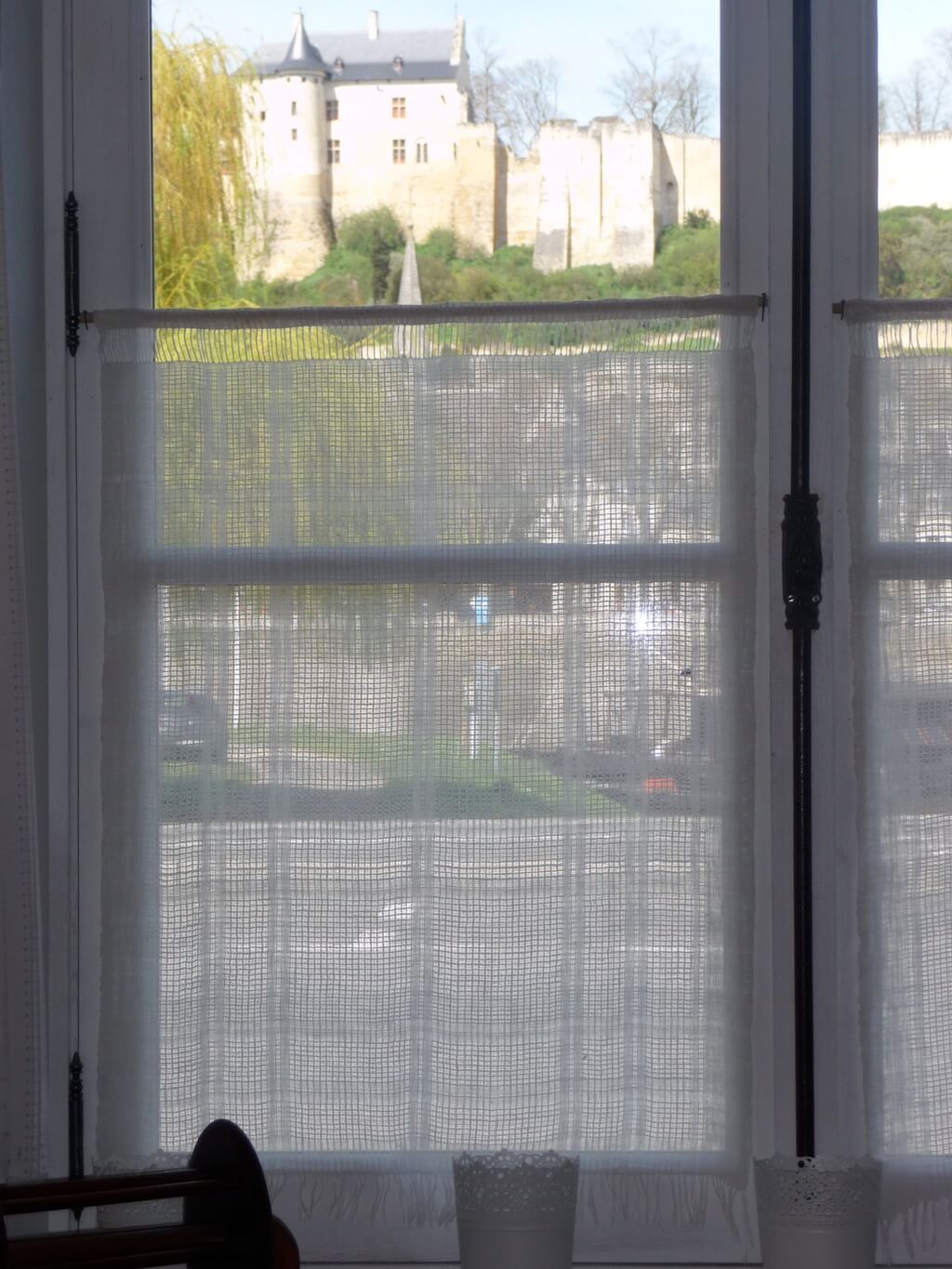 Au final, mes rideaux sont parfaits. L’armure et le fil permettent à la lumière de l’extérieur d’être tamisée, douce. On ne me voit plus de l’extérieur, et je peux encore admirer la Forteresse de Chinon et avoir un œil sur Charles VII et Agnès Sorel.