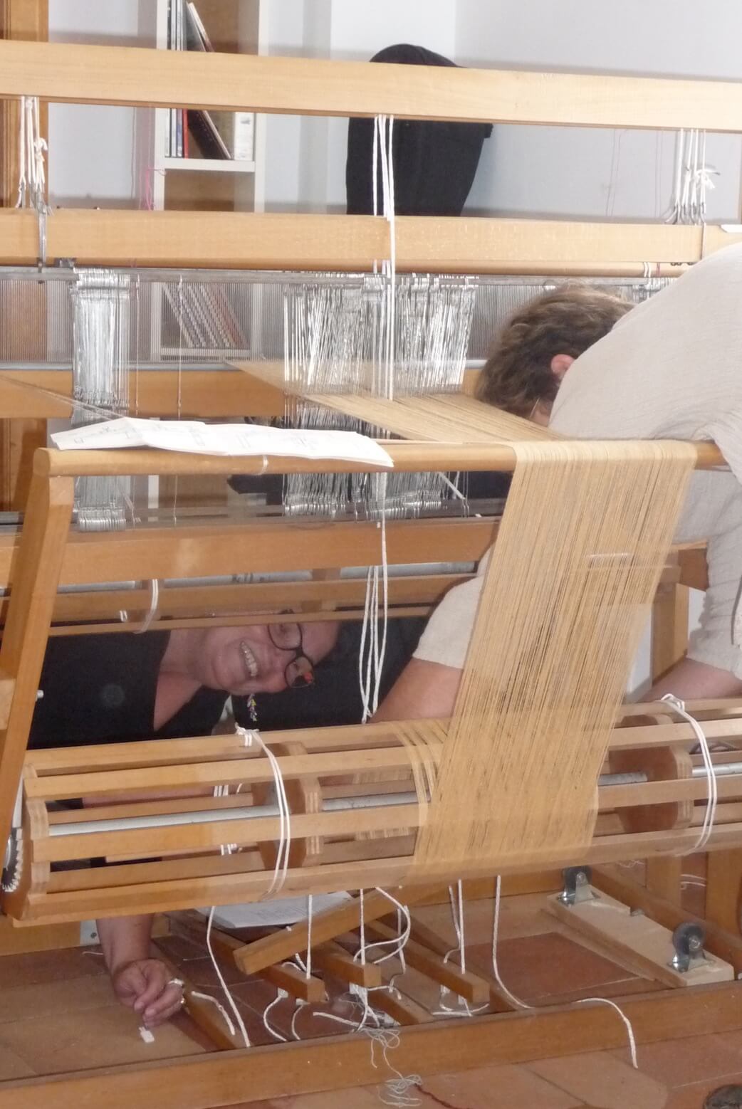 L’attachage des pédales fut un grand moment 🙂 Comment trouver un ordre de pédalage pour que pédaler rime avec marcher : gauche, droite, gauche droite… Puis, à quatre pattes sous le métier, ce fut une belle partie de rigolade… Je crois pouvoir dire qu’ensuite, Christine a plus qu’apprécié le choix de l’attachage. Pédaler était un jeu d’enfant. Jamais un pied sur deux pédales, toujours le pied gauche puis le droit. Et jamais mal au dos !!!
