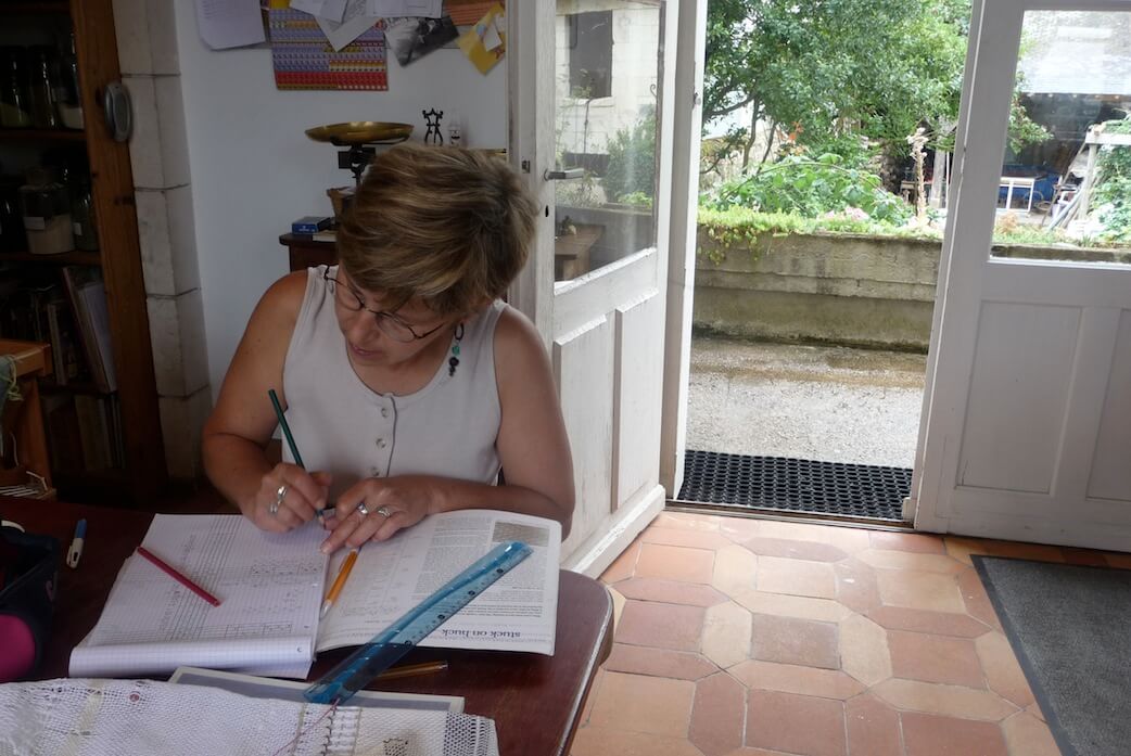 Christine, ARTisserande chevronnée, et participant aux ateliers mensuels depuis un an, venait pour son deuxième stage… Elle voulait découvrir et « maîtriser » l’armure été-hiver, ainsi que tisser sur un métier avec pédales. En effet, avec nos métiers transportables, nous en oublions presque que le tissage peut se faire aussi avec les pieds. Les premiers jours lui ont permis de comprendre l’idée des blocs en tissages. Les dessins en blocs permettent de mieux visualiser les projets et ainsi de mieux anticiper pour inventer son tissage plus facilement.