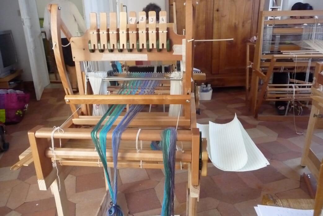 Nous avons aussi un peu discuté des différences entre l’enroulage de la chaîne par l’avant ou par l’arrière, de l’intérêt de chacune des méthodes et de leurs inconvénients. L’idée est toujours la même ! Rendre ces étapes de préparation au tissage très simples pour ne plus y penser, que cela ne soit plus un obstacle et que cela permette un tissage dans de bonnes conditions : plus de problèmes de tension lors du tissage. Nathalie, un peu noyée par tout ce vocabulaire nouveau, découvrait ces étapes de mise en route et n’en perdait pas une miette. Elle savait qu’elle devrait elle aussi, dans les jours à venir, ourdir, mettre en râteau, enrouler et utiliser les poids et les baguettes d’enroulage, tout cela pour monter la chaîne avec des fils de même longueur et de même tension.